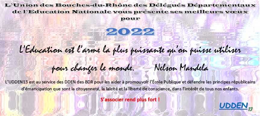 – L’Union des Bouches-du-Rhône des Délégués Départementaux de l’Education Nationale vous présente ses meilleurs vœux pour 2022. Suivre le lien