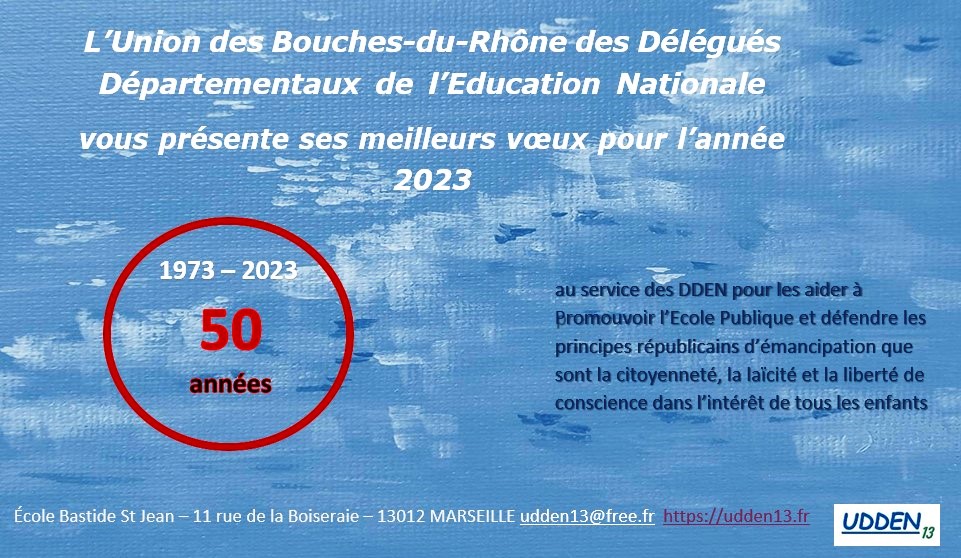 – L’Union des Bouches-du-Rhône des Délégués Départementaux de l’Education Nationale vous présente ses meilleurs vœux pour 2023.