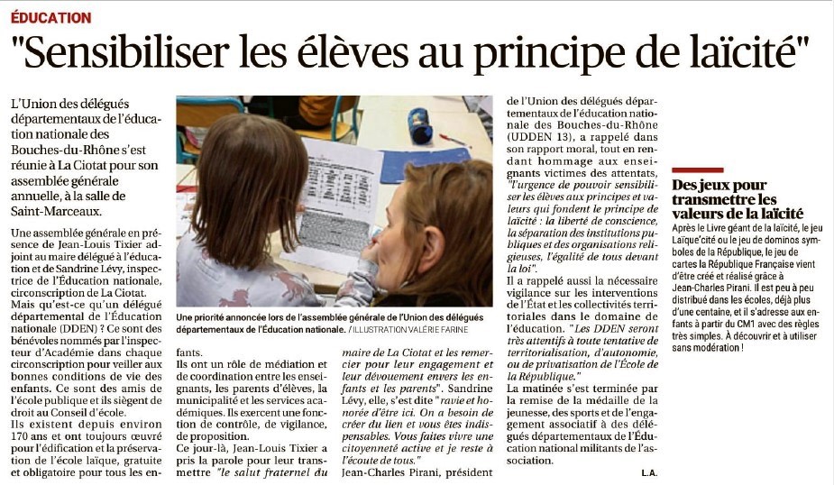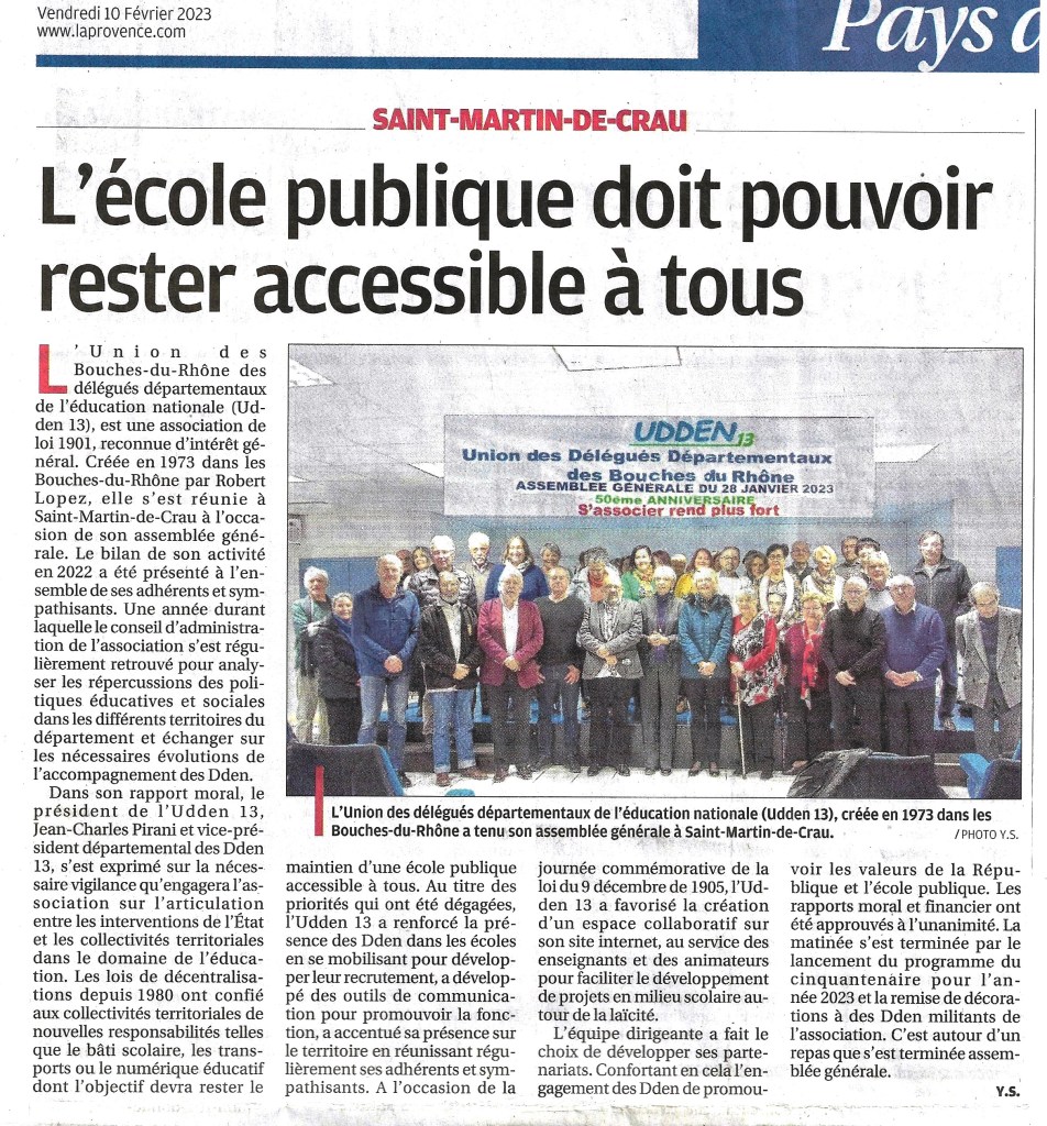 – La Provence du 10/02/2023. L’Union des Bouches-du-Rhône des délégués départementaux de l’Education Nationale (UDDEN13), créé en 1973, a tenu son assemblée Générale à Saint-Martin-de-Crau. Cliquer pour agrandir l’article