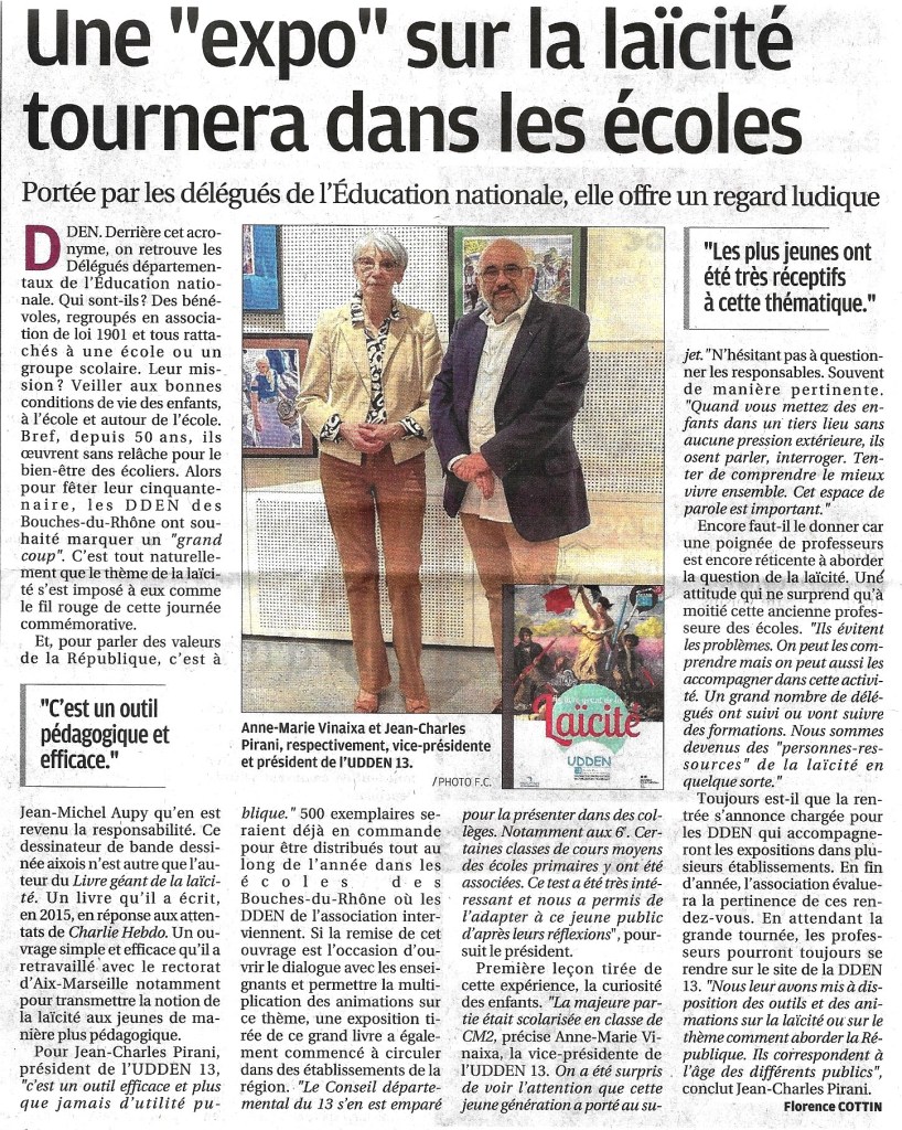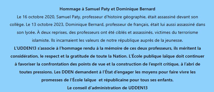 – Se former à la laïcité : Dans le cadre de la préparation de la journée nationale sur la laïcité du 9 décembre, les administrateurs de l’UDDEN 13 vous proposent de participer à une après-midi information et échanges, le mardi 23 novembre de 14h à 18h au siège de l’association : suivre le lien