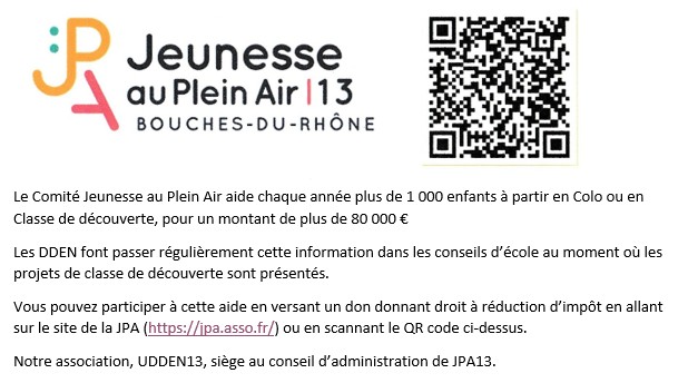– Soutenir la JPA13 : Vous êtes nombreux à faire un don chaque année pour nous aider à aller plus loin pour combattre les inégalités sociales par l’accès aux vacances. Si vous faites un don avant le 31 décembre, vous pouvez bénéficier d’une réduction sur votre impôt sur le revenu 2022. Ainsi un don de 30 € vous coûte en réalité 10.20 €. L’UDDEN13 est membre de la JPA13, elle engage ses adhérents à soutenir son action qui vise à favoriser le départ des plus modestes en colonie de vacances et en classe de découverte. Suivre le lien