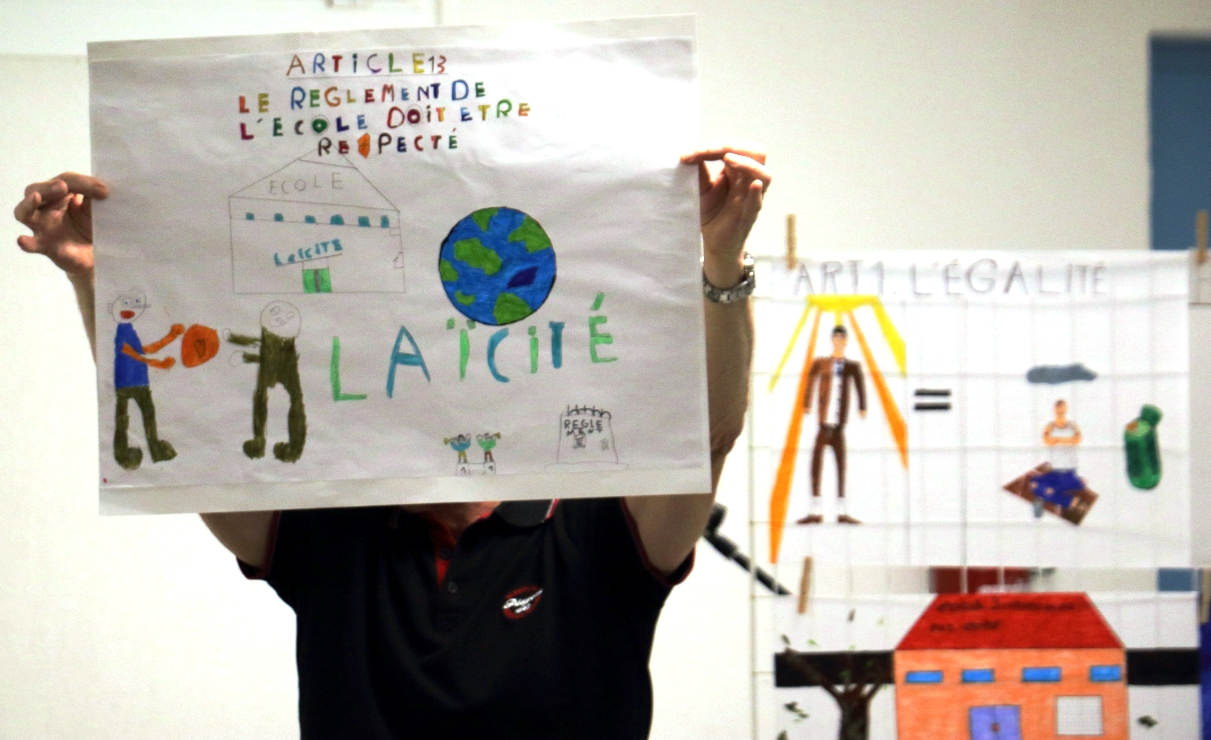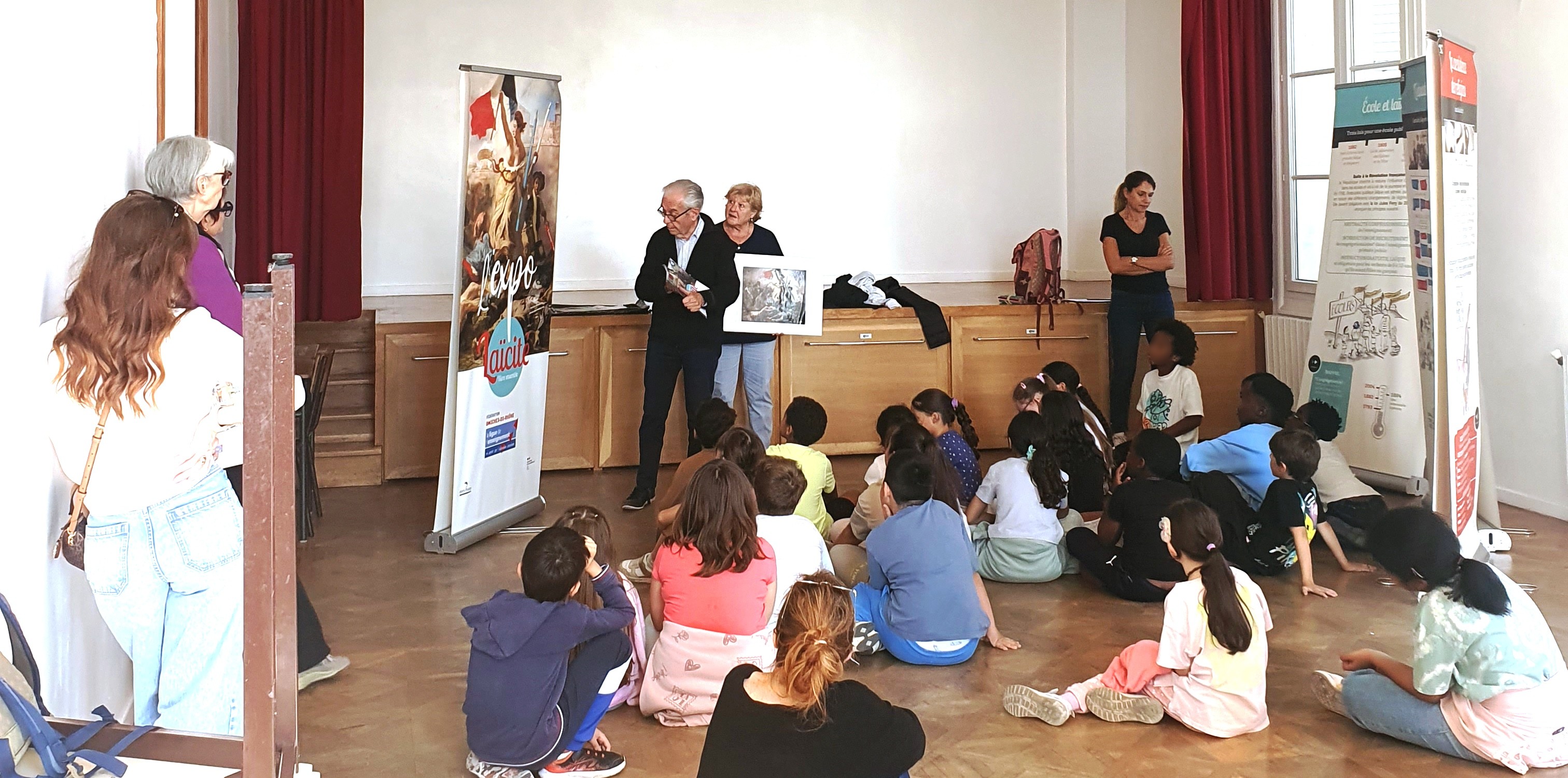 > Accueil du Grand Tableau Laïcité et projet Timbres Laïcité dans plusieurs écoles.