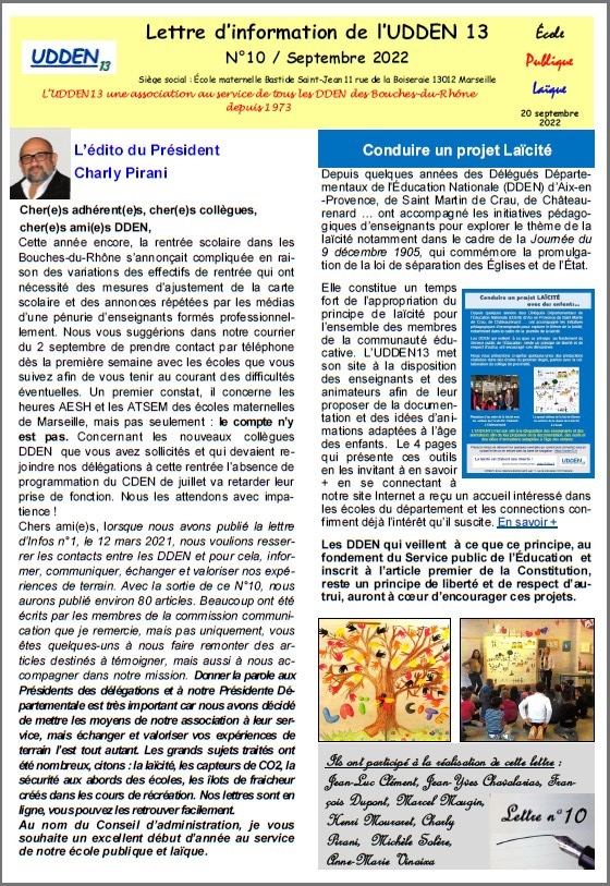 Vous trouverez en page quatre un article de la Présidente Départementale sur cette rentrée qualifié de » en demi-teinte » et un retour sur les 20 ans de l’Observatoire de la Laïcité de Provence et d’AIX (OLPA ). Le dernier livre de Philippe Meirieu ainsi que les murs et le préau de l’école Abeille de la Ciotat ont retenu toute notre attention. L’équipe de rédaction vous souhaite une excellente lecture et une excellente rentrée..