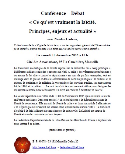 Chers collègues Adhérents ou sympathisants de l’UDDEN13, nos amis de la Libre Pensée des Bouches-du-Rhône organisent une réflexion sur la laïcité à laquelle ils nous invitent à participer.