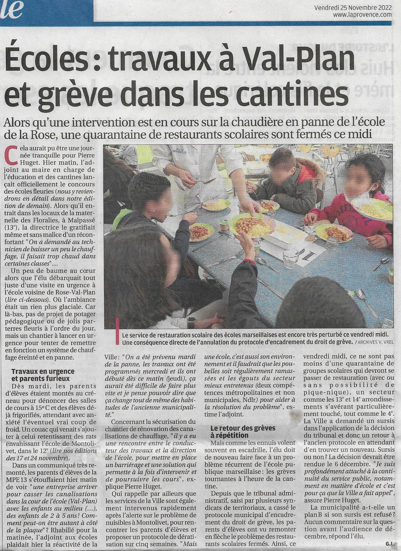 – La Provence du 25 novembre 2022 / Ecoles : Travaux Val-Plan et grève dans les cantines. Cliquer pour agrandir