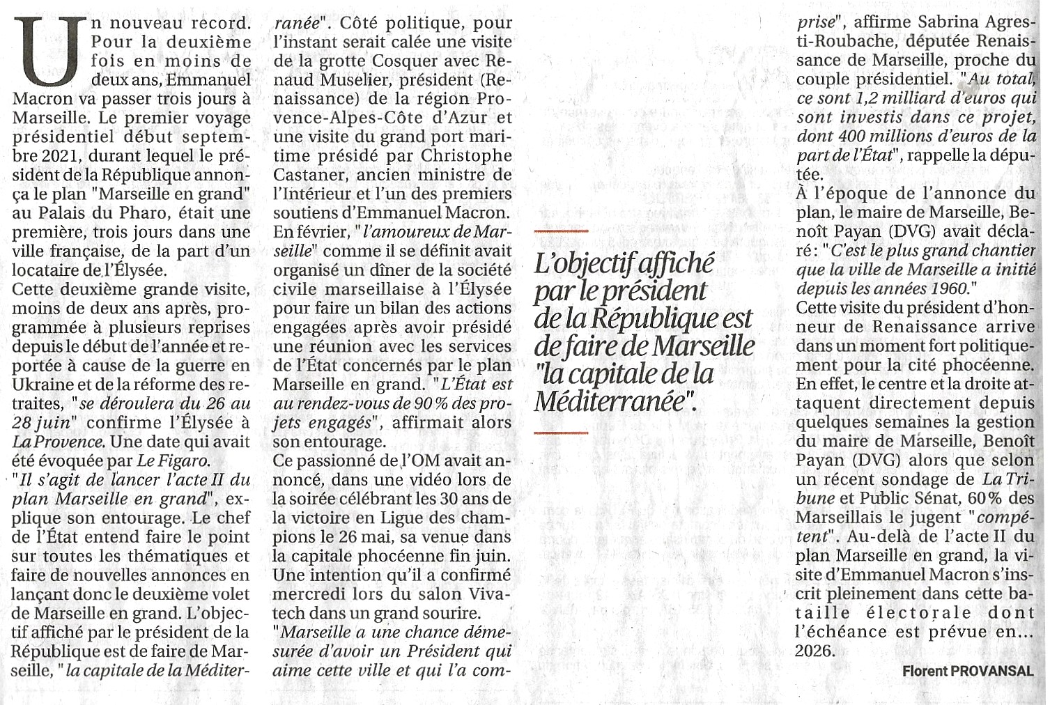– La Provence du 16 juin 2023 : Emmanuel Macron viendra du 26 au 28 juin à Marseille. Cliquer pour agrandir le texte