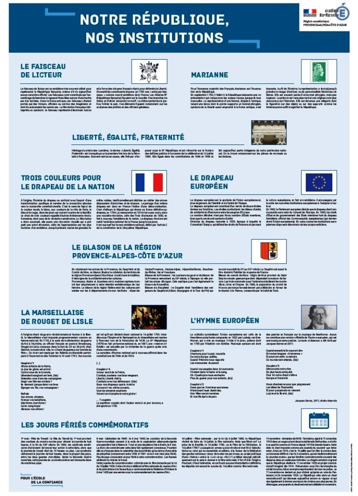 – Les symboles de la République : Afin d’offrir à l’ensemble des personnels, élèves et parents une présentation de l’origine de certains des symboles de la République et dates commémoratives, l’académie d’Aix-Marseille a réalisé une affiche destinée à être disposée dans l’ensemble des écoles et établissements.